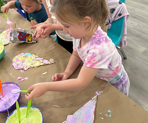 Each class is filled with playful creativity—painting, gluing, stamping, and exploring art in a way that feels exciting and safe for toddlers. Parents get to help, encourage, and share in the fun as their child learns new skills and creates something special to take home. After they create together, the kids play in our splash room, where they can explore textures, colors, and messy fun in a safe and supervised space.
